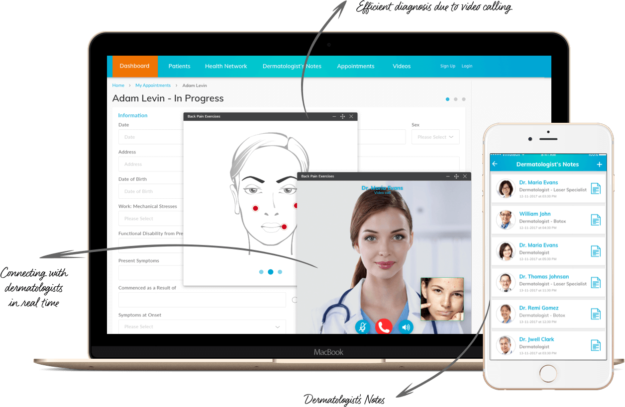 While studying the user demographics, we prepared two sides of the application: a simple location-based mobile application for patients to search dermatologists in their area and other states and a customized web application for the admin to connect patients with dermatologists. We built a complete HIPAA-compliant application that would easily win the trust of both the demographics.